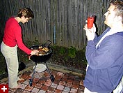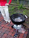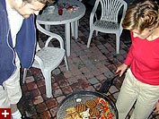 we drove to davis square to julie's place, where she was firing up the weber grille for the very first time out in the backyard. while waiting for the brickets to turn white, julie gave joel a tour of her place, since he'd never been there before. we bumped into her roommate kim, who later left. joel told us about the layoff crisis at his office, and we all reminisced about our own screen house layoff experience. when the grille was ready, julie grilled some marinated mahi-mahi steaks along with various slices of vegetables.