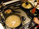 the second part was a baked boned chicken breast mixed with bok choi with bits of crushed walnuts. at one point she used all four stovetops, every single one of my cooking pots being put into active duty along with the oven. on the stereo we had oldies music which i later replaced with duran duran then went back to the oldies. both of us were scared of the gas stovetops yet at the same time drawn to its beautiful blue flame and fast heating time.