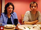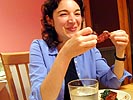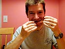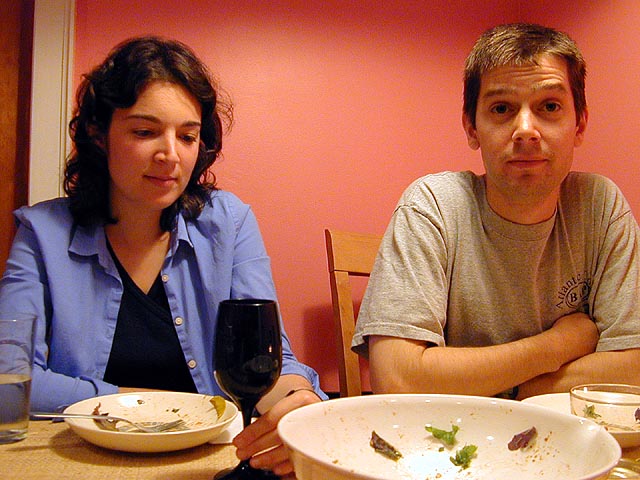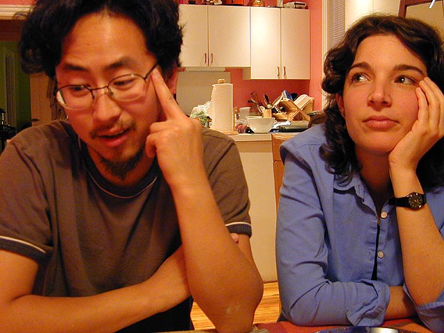 renata, her cheeks aglow from the salubrious effects of the wine, was tipsy enough to pose for several "marriage counseling" photos. she also tried to get me to eat the leftover barbecue sauce from the ribs. when we finished dinner and cleaned up, she went around putting toy centipedes and bananas down the back of our shirts with a pair of bread tongs. while andrew and renata had ice cream for dessert (cookie dough flavored), i finished the rest of my orange mango fruit juice. renata, having to wake up early tomorrow morning to come and pick me up to go down to rhode island, called it a night by 11:30pm, leaving andrew and i to watch some jackass: the movie on cable.