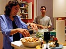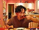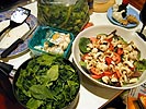 when we left the theatre, it was raining hard enough to make it impossible to have a barbecue. when we got back to our place, renata whipped up a chicken salad with the ingredients she had brought over, while i cooked the ribs in the oven. we ate the salad while waiting for the ribs to finish cooking. once the ribs were done, we dug in, andrew and renata using a two hands approach to rib management while i opted for the single hand, saving the other hand to eat the steamed spinach.