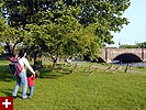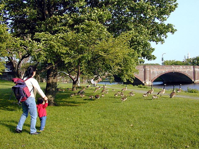avon to shepard to garden to hastings to phillips to mason to ash, then finally to the charles river. along the shores people sat on benches with the late afternoon sun shining on everyone while canada geese large and small fed on the grass.