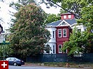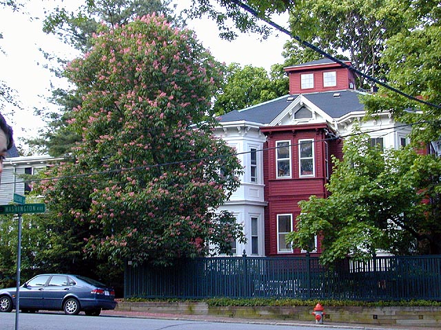 onwards to craigie to concord avenue to bond to garden to linnean into the posh avon hill area of cambridge. there, along washington avenue, was another fine specimen of pink chestnut looming before a massive mansion. we also saw the oldest house in cambridge, built in 1690 (or perhaps earlier, there's some confusion depending on which sign you read), over 300 years ago.