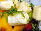 i think a sprinkle of chopped onions gives them that extra kick. i also made a fruit elixir with my last remaining banana, into the mix went frozen apricots, grapes, strawberries, melons, and some mango fruit juice. i added a touch of chopped mint leaves, something i learned from julie, which added a little bit more flavor into the elixir, and adds a nice touch of green.