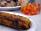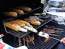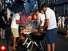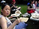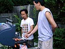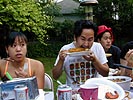 i would've stayed for the entire duration of the block party were it not for the fact that my parents were having a barbecue in belmont. my sister, my 2nd aunt, my aunt lili and my uncle matthew, my godmother and her two sons, suhan, and for some reason, our next door neighbor, a nice couple who recently had a baby along with the wife's chinese speaking parents. my godmother gave me a cheese grater (G5!) and a teakettle as gifts. the neighbors left soon after i got there, which meant more food for me. barbecued porkchops, lamp shishkabob, corn on the cob, jumbo shrimps, abalone, bubble ice tea, cold green pea soup, peach pie, and of course roasted marshmellows.