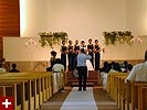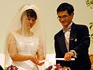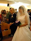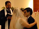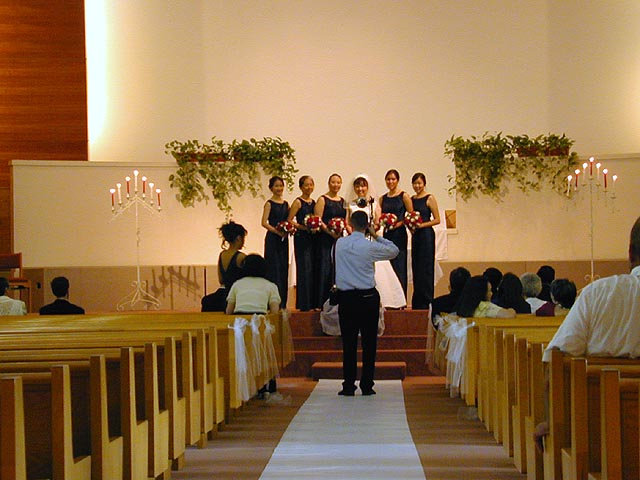this was also my first protestant service, having already been to catholic and jewish weddings. the thing i found about this particular service (not sure if it's the same for all protestant weddings) was how fast it was. there wasn't any of the "peace be with you" handshakes and numerous chanted replies over what the priest says as there is in catholic service, a lot less ceremony, a little more "let's get to the point of why we're here." they had an aisle runner as well, and after they exchanged vows and rings, they lit a unity candle. my family sat in the third row, very good seats. i started to get worried, not over the wedding, but over the fact that i didn't unplug the iron (i did turn it off though). i was also the only guy not wearing a suit jacket. it was in the car, but i didn't wear it because it was 90 degrees outside (however, inside the church itself there was good air conditioning). the priest surprised me when he talked about "super relationships" and said marriage isn't just about "great sex." (yung-hsin, who i talked to later, even though he didn't actually see the ceremony, heard the part where the part priest spoke about sex). one of yung-hsin's younger brother had a moustache (i called him "señor moustachio"), which could possibly inspire me to forgo my own goatee and go with a moustache look. from the corner of my eye i noticed that my mother was crying during the ceremony.