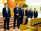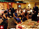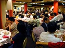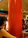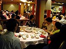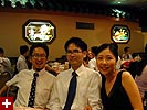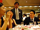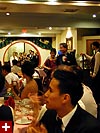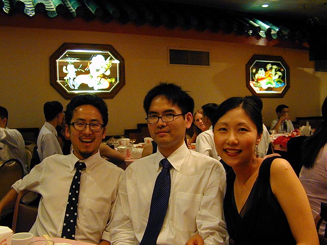 california joanne who'll soon go back to the west coast, smiling steve, who laughed at all the jokes, hannah, a GI (that's doctor talk for someone who specializes in gastro-intestinal), hepa (yung-hsin's younger brother, "hepa" is his nickname, short for "hepatitis"), and hepa's girlfriend sou. there were two empty seats next to me which i was very happy to find out were reserved for yung-hsin and jillian. the seats that we had were obstructed view seats, right behind a pillar, so as the evening progressed and there was activity in the center of the dining hall, we could only hear what was going on.