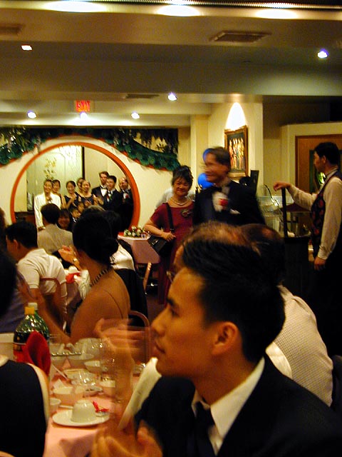 after the slideshow (10:30), everyone started to head out. the restaurant was starting to close anyway, and apparently they had turned off the air conditioning to quickly usher the remaining guests out so they can clean up. we said good bye to liwen and tyrone one last time before leaving. yung-hsin said to me, "good bye my dead friend," and i laughed and left. driving home, we bumped into yung-hsin's family one more time as they walked to their car. i waved the complimentary porcelain wedding chopsticks we received as gifts before disappearing into the night.