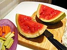 eating the leftover barbecue food i'd saved her underneath the safety seal of clear wrap. she ate only the hamburger, and ate it in the kitchen as well, standing by the counter (i guess people really love that kitchen). our $3 watermelon turned out to be a dud, suffering from some sort of melon hydrocephalus, the very soft spongy part smelling rancid and tasting no better. lesson of this story: never buy cheap watermelon that are too good to be true (i should know, i taste tested it).