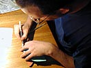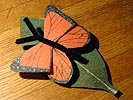 when we came back, i took some photos of bruce's little craft project, a monarch butterfly on a leaf sprig (milkweed?) with a simulated egg made from aspirin on the underside. the monarch was made from construction paper and pipe cleaners, the veins on the wings drawn with a black glitter pen.