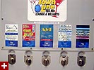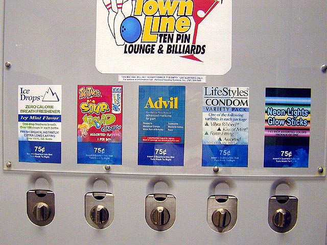 and that was just for myself. townline bowling definitely has a towny charm compared to king's, which is more of an upscale cosmopolitan swing joint, but if you want cheap bowling with a cosmic "atomic bowling" decor (which unfortunately only happens on weekend nights, there was no black lights for us), look no further than townline bowling. before we left, bruce told me to check out the vending machine in the men's room. i took a quick photo and left.