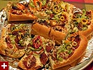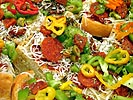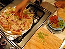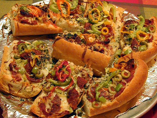 i discovered julie and i have different tastes in our pizza ingredients. i like to cut my pepperoni into little wedges, while julie likes then circular and thin. i like my pepper chopped into cubes, while julie likes them in slices. they don't have french bread at star market, so i went with italian bread, which is a little wider. besides a meaty pasta sauce and a sprinkling of cheese, we also added some olive slices, fennel seeds, dried basil and oregano powders, fresh ground pepper, and hot pepper slices (a lot of pepper products!).