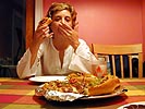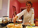i asked julie if she had dinner already, and if not, whether she wanted to come over where i was making some french bread pizza. she agreed to come, which was kind of auspicious, because originally she was supposed to meet up with another friend but cancelled because she had a headache, which miraculously disappeared after she watched an episode of queer eye for the straight guy.
