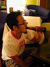it was also auspicious for me because to be honest, i was simply bored out of my mind tonight, and just needed some excitement. excitement came 30 minutes later when julie arrived in her dressy work clothes along with a six pack of smuttynose old brown dog ale. i turned on the air conditioner because it was still quite humid, while julie busily snacked on the potato chips (i also had some biscotti, but julie didn't touch any of them, so i ended up having it all). we watched an episode of that 70's show (julie thinks our beloved mutual friend rob house actually looks like eric forman) before going into the kitchen to make our pizza.
