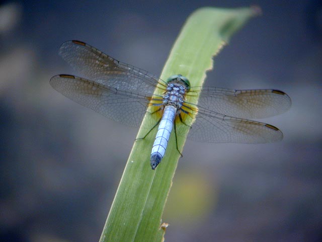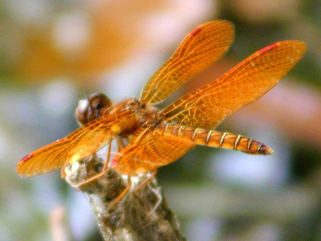 there's always plenty of dragonfly activity around the pond. i discovered that with the 24x zoom set to macro, i can take fairly decent photos of dragonflies that i normally couldn't get without falling into the water. some of them were perched, chasing other dragonflies out of their territory, while still others were engaged in mating, the male clasping the female in tandem pairs. i also saw a whitetail and a twelve-spotted skimmer, but none of them stopped long enough to be photographed.