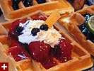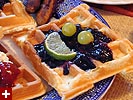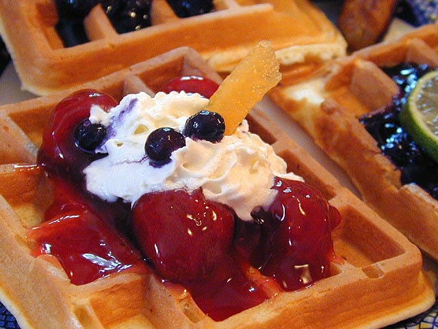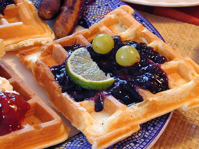 the blueberries turned out to be critical to the success of our breakfast when renata saw that i've been keeping my strawberry topping in its original metal can, not to mention the fact that my whip creme had already expired. she even called her mother, who told us that we could get ptomaine, which later i found out was a fancy way of saying food poisoning. while i made the waffles on the waffle iron that i don't like very much because it's a mess to clean up, renata was making the blueberry compote on the stove, adding such other ingredients as corn starch, honey, cinammon, ginger, and mint.