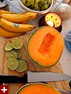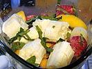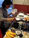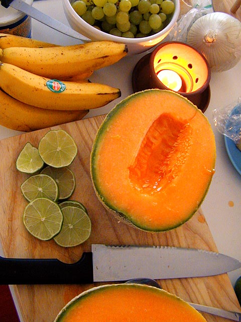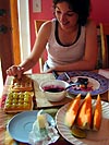 since that time, i've had 3 months to refine my techniques. i decided to start cooking without renata, whom later i found out was delayed because she was talking with a neighbor. it would be the first breakfast cooked almost entirely via appliances: smoothies from the blender (frozen peaches, strawberry, grapes, honeydew, pineapples mixed with a banana and some mango-orange fruit juice with a sprinkle of fresh mint leaves), sausages from the foreman grill, and belgian waffles from the waffle iron. by the time renata arrived, i was mixing the waffle batter.