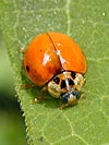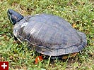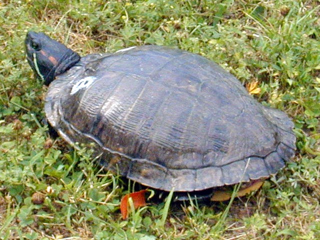 i didn't recognize what it was at first, then i saw it move. SON OF GAMERA! this thing must've been 6" long, had some markings on its head that made it look like a painted turtle, but it was way bigger than any painted turtles i've ever known and its shell looked nothing like a painted turtle shell. i wish some turtle expert would just call me and let me know what this monster is so i can stop having nightmares. i didn't notice it at first (the fear and loathing have a blinding effect on me), but when i got home and saw the photos, i could see that this turtle has been tagged, and not only that, but there seems to be numbers painted on its shell. two women walking their dog came by, which seemed to spook the turtle (that's ironic, the object of my most primal fear is actually afraid of something itself), which quickly (for a turtle anyway) crawled away to hide underneath a bush. i took a few more snapshots before running away as fast and as far as i could from this unspeakable monstrosity.