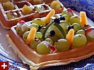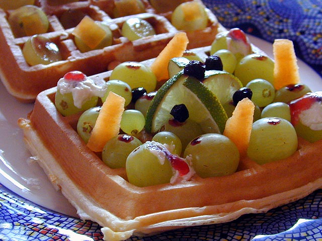 when i had my back turned, renata arranged faces on my waffles with pieces of fruit. she was only able to finish 1.5 waffles, and i barely made it to 2. renata, her desire to play with her food not yet quenched, took the two remaining waffles hostage and started to dress them up with more pieces of fruit. i could only watch in horror (tempered by curiousity) as perfectly good waffles were tranformed by the produce fairy good mother into works of fruity art.