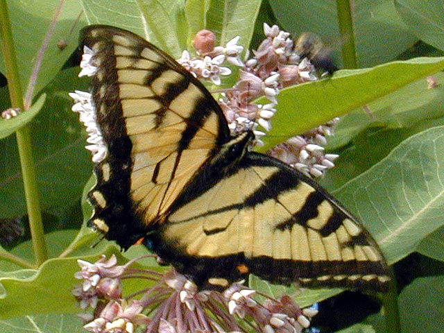 in seasons past i remember they were a common sight, but not this particular season. i did discover that milkweeds, when grown in large enough of quantity, is actually a rather fragrant plant, its flowers scented somewhat like lilacs. even though it failed to attract the monarchs, it had no problems in attracting all sorts of other flying insects, from bees to wasps to flies, from daytime moths to other butterflies (including a tiger swallowtail, tattered, nearing the end of its life).