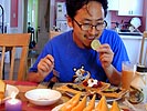 once i made it around the pond, i hopped back on the motorcycle and went to my parents' place. i went with them on their weekly supply run at bj's and costco, returning to my own place to drop off my supplies (bumped into andrew and maura having dinner), then i went back to my parent's place to have dinner along with suhan. i was pretty hungry, having not eaten since this morning. i had a bowl of wonton soup, edumame beans, lamb steak, corn on the cob, some chicken wings, and a dessert of yellow kiwi fruits.