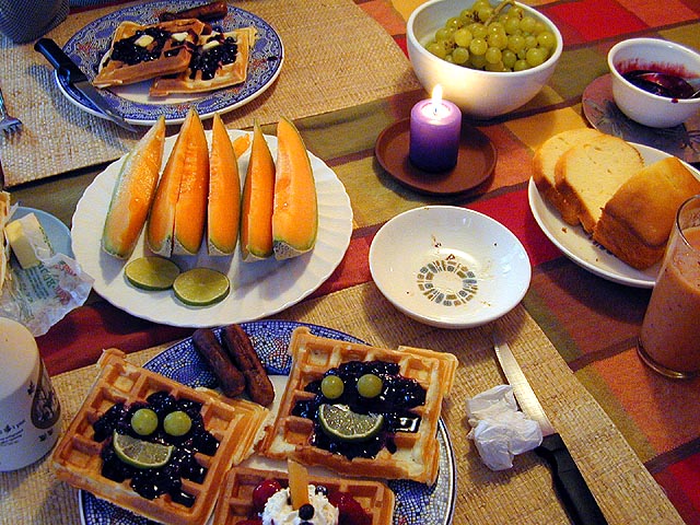 besides the waffles and the sausages and the smoothies, there was also slices of canteloupes, a bowl of green grapes, and some leftover pound cake i'd made earlier in the week. i was this close to getting some bacon at the supermarket, but figured i already had too much food.