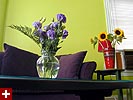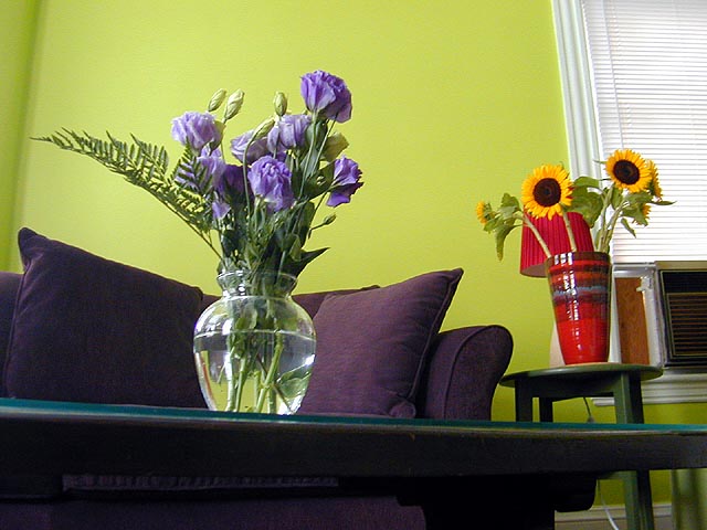 after breakfast i went out to run some errands, pick up my prescription at cvs, get some stamps from the post office, and buy some flowers. i got this really pretty bouquet with violet carnation-like flowers and white rose-like flowers. it wasn't until i got home did i realize the two flowers were actually from the same plant. i couldn't for the life of me figure out what kind of flowers they were, even after renata told me one possibility (i forgot the name). these flowers, in addition to the sunflowers i bought over the weekend, made my living room look like a flower store, or perhaps a funeral home.