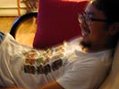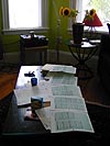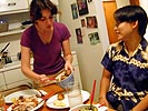 renata continued with the cooking, steaming some bok choi and making a cold salad from the vast quantity of fresh produce in her fridge. while we waited for chicken and potatoes to finish cooking and for kay to arrive, we sat on the couch and vegetated, renata throwing me magazines and books to keep me entertained. she continued to ask me how to erase photos from my digital camera, something that i haven't shown her yet because i was afraid she'd erase the whole memory card.