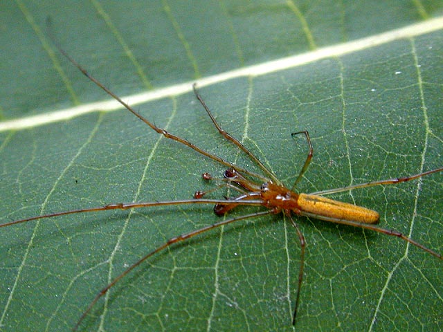 at first i thought maybe it was an abnormally long silverfish, but upon closer inspection, i realized it was actually a spider. i've never seen a spider like this, all "elongated". from the photo you can see that it's a male spider because it has clubs on the tips of its pedipalps. when i got a little too close for comfort, the spider broke out of its elongated resting position and opened up to a more traditional spiderform. also notice that the third pair of legs is is normal sized while all the other pairs are super long.