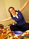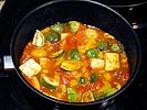 we found an old container of margarine and some non-stick pam grease spray. the coconut milk i got was the wrong kind, coconut cream instead, which was this sweetened syrup used for making cocktails, not really for cooking. it still worked, but the coconut fragrance wasn't as strong and the curry feel on the sweet side (although still very spicy). i used small thai eggplants which my mother bought from the 88 supermarket, as well as two different colors of peppers (red and yellow). amelia's a vegetarian, so i cooked two different versions of the curry, one with chicken, one with tofu. they entertained themselves with brooke's digital camera while i cooked, using the superimpose function of the nikon 4500 to take inappropriate special effect photos.