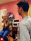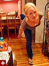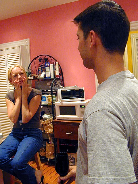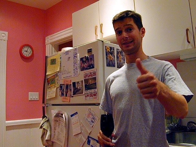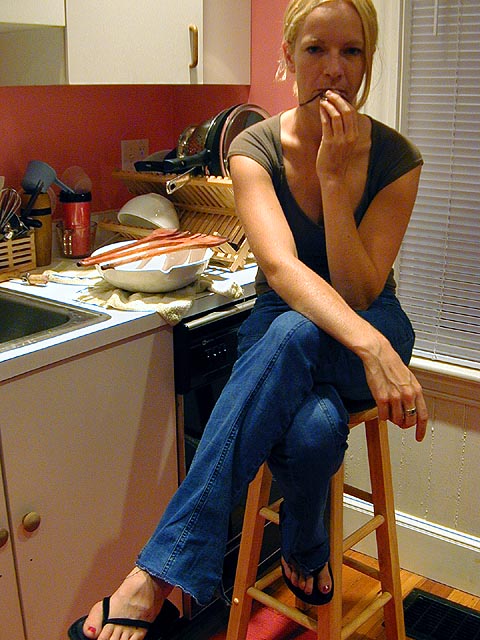 as if all that wasn't enough, i also made some smoothies, temporarily turning off the fan so i could use the outlet for the blender. andrew came home 8ish right when the cooking was getting hot and heavy. mandy laughed in disbelief when she realized i put my red wine in the fridge. the three of us got a little liquored up, while mandy and andrew exchanged kids of divorced parents stories, their lives sharing amazing parallels. while chopping some onions, mandy told me about a trick to not crying, which is to put a piece of onion in your hair.