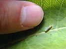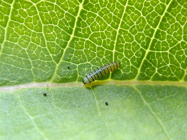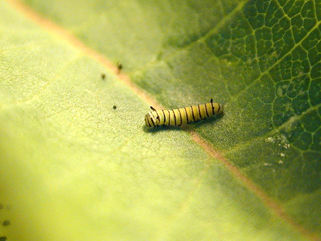 "put me online!" one of them shouted, not realizing it was already too late. i thought about giving them the url to the weblog, but hesitated. "on second though, don't put me online, it's creepy." yes, creepy. when we got back to the house, i checked the monarch caterpillar, it had eaten some more of the leaf, and less than half a day later, i could see the antennae and more distinctive yellow-black-white stripes.