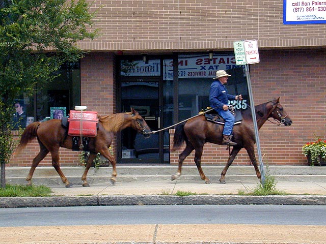 driving back to our region of cambridge, we saw a man riding a horse on the sidewalk, leading another horse behind him. this was on mass ave, a busy thoroughfare, and the horses were going towards the city, not away from it. it's one of those things that's so weird you almost ignore it in disbelief, but bruce pulled the car over so i could poke my head out of the moon roof to take a photo.