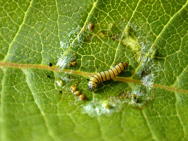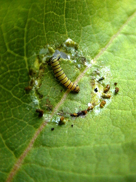 trying to resolve meat from the bones. i was happy to see that my Danus plexippus caterpillar had started to eat again after having relocated its position yesterday. it feeds by turning itself from a central point, its body a measure of the radius as it nibbles out a circle. each bite of the leaf releases white milkweed juice, which is poisonous for most animals but not for the monarch caterpillar. the circle's perimeter is also lined with caterpillar poop, its kitchen is also its bathroom.