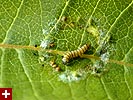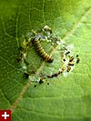 checking up on the progress of the caterpillar, it was still busy eating, wiggling around as it pivots to more fleshy parts of the leaf. caterpillars don't look very much like the mature insects they'll eventually become, with the exception of their head, which still has a strong bug-look to it.