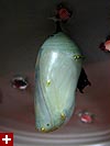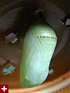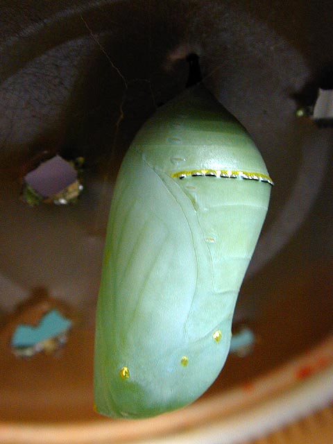 bruce dropped by with his junior jar, eager to share with me the near final stage of metamorphosis, junior's chrysalis now almost completely transparent, the full grown adult monarch butterfly tightly encased in that chitinous shell,