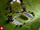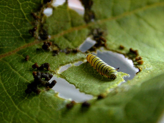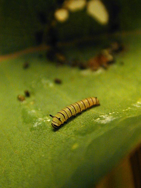 i got dressed and went out to cash some checks at the porter exchange. i dropped by bruce's place on my way back, the latest news on the butterfly front is that junior was showing signs of maturing into a butterfly, its chrysalis beginning to clear up. i went home and saw that my own monarch (still in its caterpillar stage) had eaten more of the milkweed leaf, still weeks away before it matures into a butterfly.
