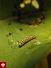 the unmistakable characteristic orange-black patterns of the wings clearly visible now. i took two rounds of photo that we reviewed on the television after i finished taking them. after bruce left, i checked up on the progress of my own monarch progeny, which looked to be in a state of molting (motionless, rigid), which bruce informed me the caterpillar will eat its own shell after it's done shedding.