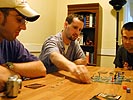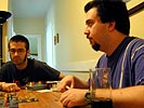 while eating our chinese food, we played some too many cooks, a card game with suits like mushrooms, peas, hot pepper, and onions, the theme being you're making a certain kind of vegetable soup. i liked it because it had a food theme. when we were done eating, we started a game of lord of the rings. this was my first time playing this game having seen the movie, so things made a little more sense. this was the expansion edition, and mike got to play sauron, while the rest of us formed the party. we were able to beat sauron after suffering a near fatal "death", but the game was asterisked because there was some confusion as to the rules, which in my opinion is a sign of a poorly designed game. brendon left after the game.