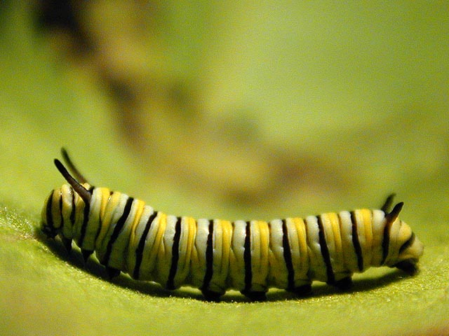 after the movie, elias gave dan and i a ride back to dan's place. i got my bag and helmet, then rode home, navigating amongst the throng of drunken bar patrons flooding the streets of allston after all the bars close their doors at 2am. when i got home, i checked up on the caterpillar, it was already larger than what i remembered this morning, busy eating the leaf, chomping instead of nibbling now, full-sized adult bites.