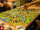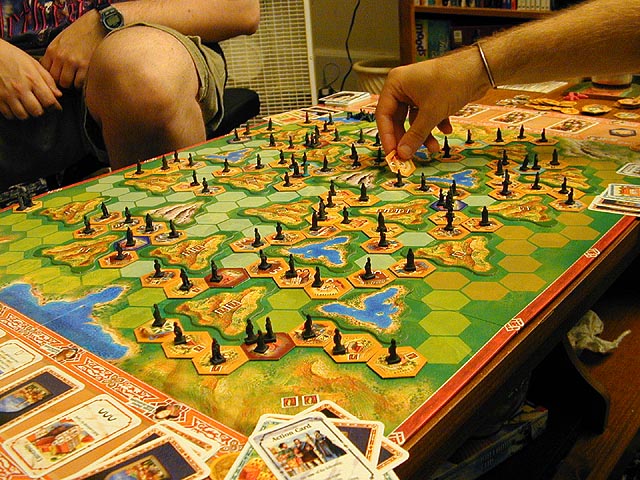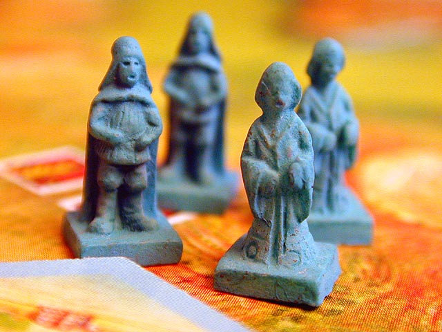 but with a focus on developing cities, resource management, and stealing away citizens from neighbor towns. i like the people pieces, looked like tiny ceramic statues. mike and i tied that game, with the tie-breaker being who had more gold,