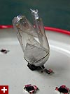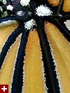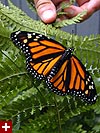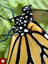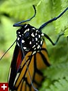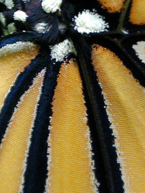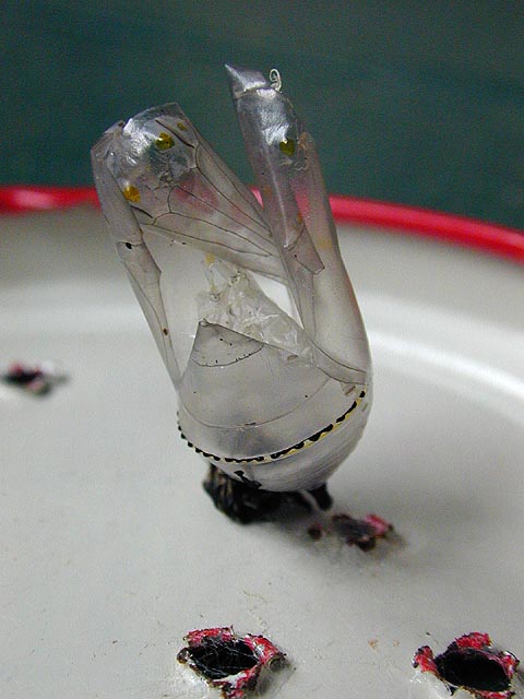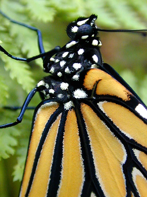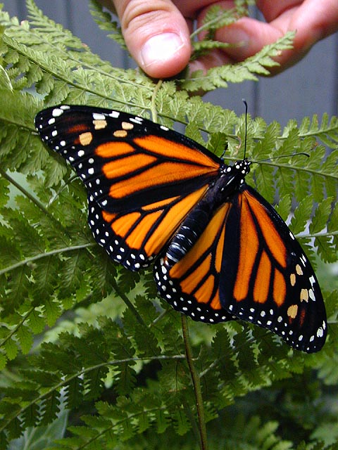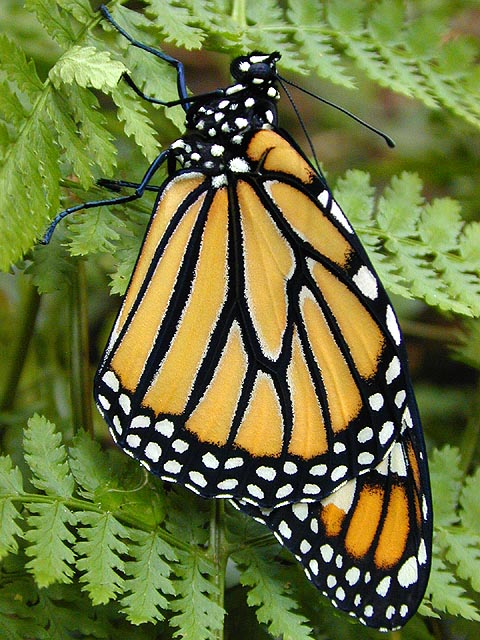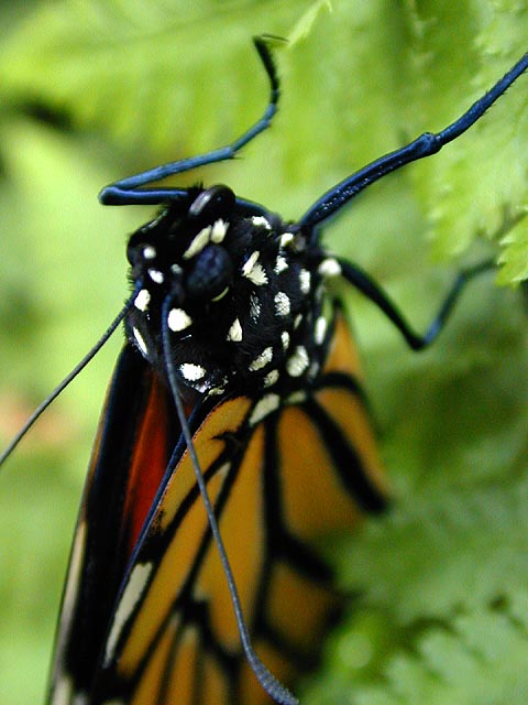bruce called to let me know that the butterfly - a girl - had hatched. i got up and went next door to see it. it had hatched perhaps a few hours ago, its wings already open, sitting on a fern in the backyard, waiting for everything to completely harden before flying away. occasionally it'd spread out it's wings, or flex its proboscis like a party favor before curling back in. we could tell its a girl because its missing these black "spots" on the hind wings. i could see the wings were made up of tiny colors scales, and i never realized the body is actually black & white polka dotted, a very pretty butterfly. i tried pulling off the chrysalis from the jar lid, it was securely attached with silk.