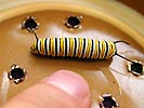 cat v.2 ate most of its leaf, hanging on by just the stem. it was time to change the leaf, which was how i killed my first caterpillar, so i was extra careful not to repeat myself. as soon as i made the switch, the caterpillar crawled off the leaf onto the jar lid, where it hasn't moved since. at least the top of the jar is better than the bottom of jar, where there's the danger of water to drown in.