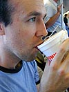 i got changed out of my business outfit and into my running gear. i left the office with alex and kristine, who both had already ran yesterday. unlike them, i try not to run on consecutive days, to allow my legs some time to heal between runs. the weather was warm but dry, and there was a strong breeze, which was nice. i bumped into debra may again, who didn't recognize me in my circa 1992 macworld boston t-shirt and contact lenses. we cut through downtown crossing, across boston common, then to the charles river, down storrow drive in the direction of MIT, stopping at an exercise relay station. they ran at a light pace, which is good because it's not bad on the knees and allows us to chat throughout the whole run, but slow compared to my usual one man pace. i guess now i know where i stand on the running spectrum, i run to exhaustion when i'm by myself, using up as much energy as possible going as fast as possible, so it was nice to take a break from all that hard running. we did some chin ups and pull ups at the relay station, alex and kristine doing some sit-ups on the soft grass while i did some bicycle crunches on the hard asphalt. coming back, i had so much energy left that i went crazy, chasing piegons, jumping every so often to touch a leaf up in a tree, pick up broken branches and smash them against tree trunks, or stomping on twigs. when we arrived at boston common, we ran up a hill, and i proceeded to run in zig zags and circles, finally feeling that familiar sensation of utter exhaustion.