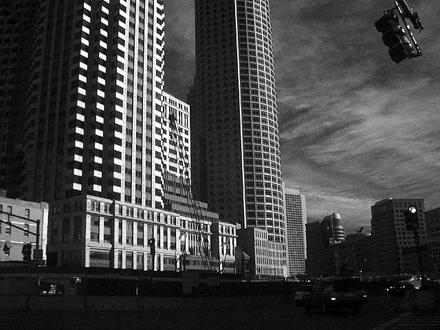 i took a bit of a detour getting back to south station, so i could catch a glimpse of the newly demolished I-93. boston seems so empty now without that green monstrosity of an elevated highway. from a certain point near south station you can see not only most of the tall buildings in the financial district, but also the prudential and hancock towers in boston's back bay.