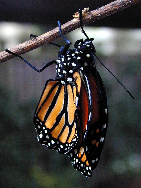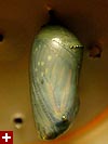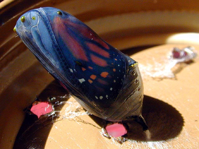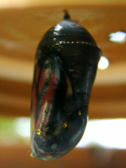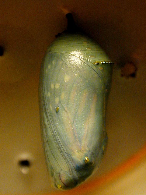 when i got back home, i was happy to see that my butterfly chrysalis had not hatched yet, although it had turned significantly darker and more transparent. the wings were now clearly visible and i could see the polka dotted pattern on the butterfly's thorax. i figured definitely tomorrow morning a butterfly would be hatching.