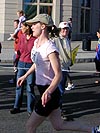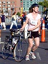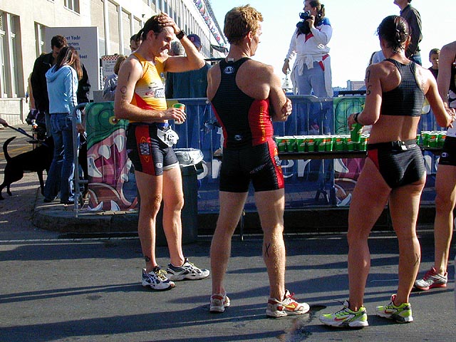 triathletes are a weird lot. their bodies aren't shaped like marathon runners, they're not bone skinny. they're not jacked up with muscles like weightlifters. they're just sort of in-between, skinny but muscular at the same time. you can also tell who're the triathletes because they enjoy writing numbers on themselves with markers and they're not shy about wearing skimpy running outfits, male or female.