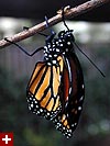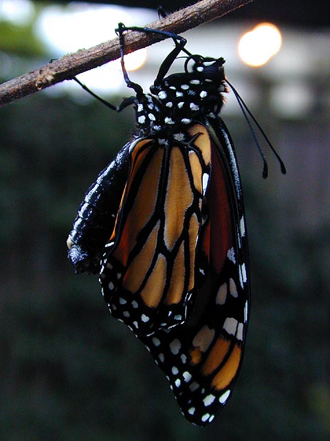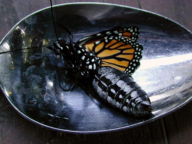 it was kind of shocking, the newly hatched butterfly looked nothing like a butterfly, nor the shriveled up version i had thought i'd see. rather, it looked kind of like a fat caterpillar with little soft monarch wings. i was afraid to pick it up with my hands and used two spoons to scoop it up. it's kind of strange, but butterflies are suppose to hatch in the mornings so they have the day to dry out. this one was hatching in the evening, which was unusual. i quickly tried to put it on my jasmine bush, figuring it'd make a great perch.