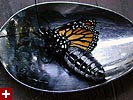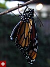 around early evening i went into the kitchen to check up on the chrysalis. to my surprise, it was empty. below the cracked chrysalis shell was a newly hatched monarch lying on its back on the kitchen table.