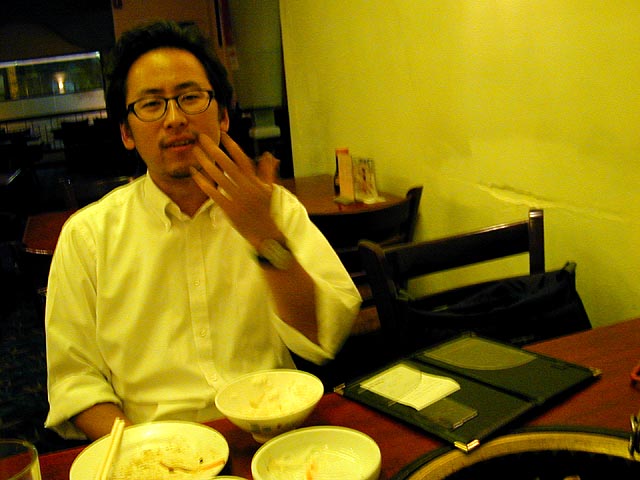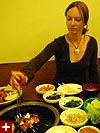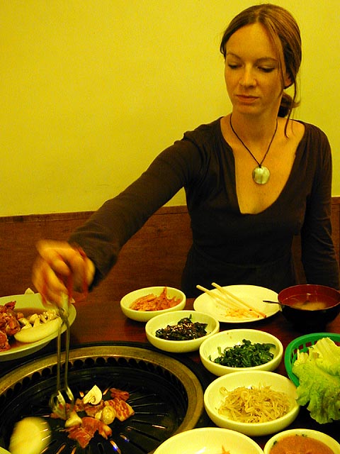 eventually she got it to light after the assistance of another waitress. when our plates of raw meat arrived, it was time to barbecue, slices of marinated beef sizzling on the metal heating plate, occasionally splattering hot oil onto our forearms as we used tongs to turn the meat. it was very delicious, but we probably ordered too much meat. the second half of the meal was more a case of forced digestion, since it'd be impossible for us to take home the stuff.