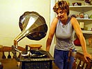 when julie heard about this, she made me move the bike anyway even though her neighbor and i struck an agreement where i could park there for the next 30 minutes. inside the house, all her roommates where home (a rare sight, i haven't seen the band all together since the day julie moved into the place at the beginning of the year), as well as one roommate's boyfriend. there was a murmur of "you ride a motorycle?" - i'd forgotten that for some people, motorcycles are a big deal. the gramophone was on the dining room table, and julie played a 78 record for me despite the fact that the device was broken. the tinny sound coming from the horn was surprisingly loud, although the music was distorted from the wobbling mechanical spinning tray. after the demonstration, i came back home, just in time to see mike leaving for his girlfriend's place. i watched the curse of the bambino documentary on HBO, i got teary eyes on a few occasions. maybe this year?